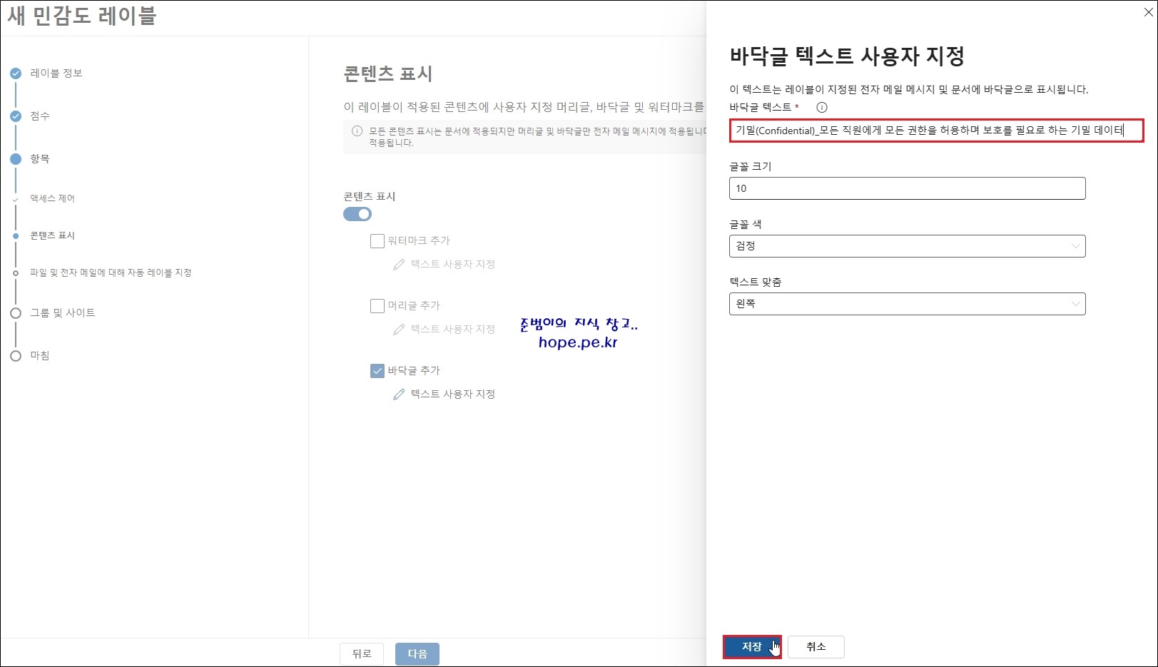 (본 포스팅에서는 바닥글 텍스트는 '기밀(Confidential)_모든 직원에게 모든 권한을 허용하며 보호를 필요로 하는 기밀 데이터' 로 입력 하였고, 나머지는 기본값을 사용 하였습니다.)