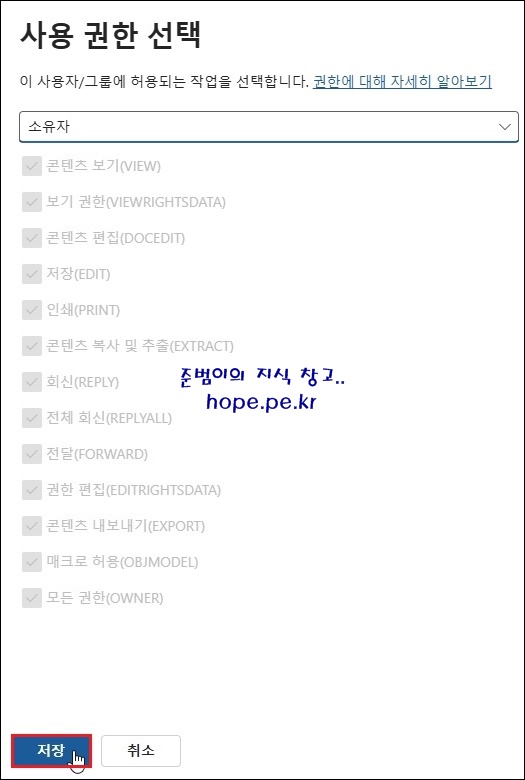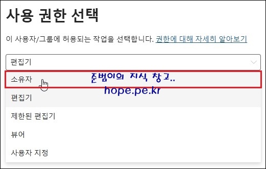 Cf) 조직 사용자에게 모든 권한을 부여하기 위해 소유자로 변경 합니다. 권한에 대한 설명은 차후 포스팅에서 자세하게 다뤄보도록 하겠습니다.