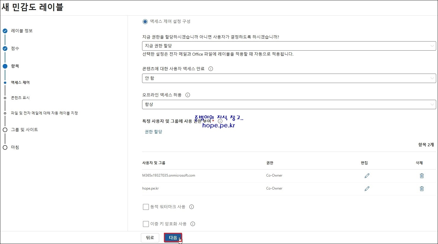 새 민감도 레이블 > 그룹 및 사이트 > 그룹 및 사이트 보호 설정 정의 화면에서, '다음' 을 클릭 합니다.