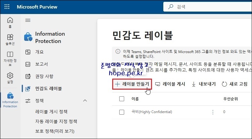 Microsoft Purview > Information Protection > 민감도 레이블 화면에서, '레이블 만들기' 를 클릭 합니다.