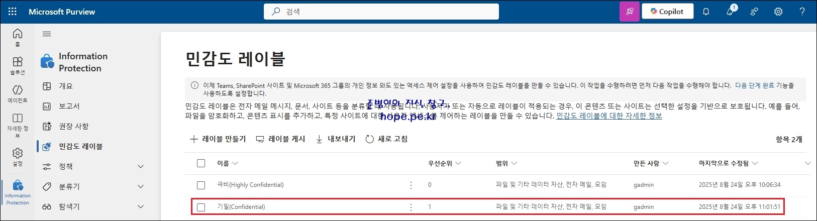 민감도 레이블 화면에서, 생성한 민감도 레이블을 확인 합니다.