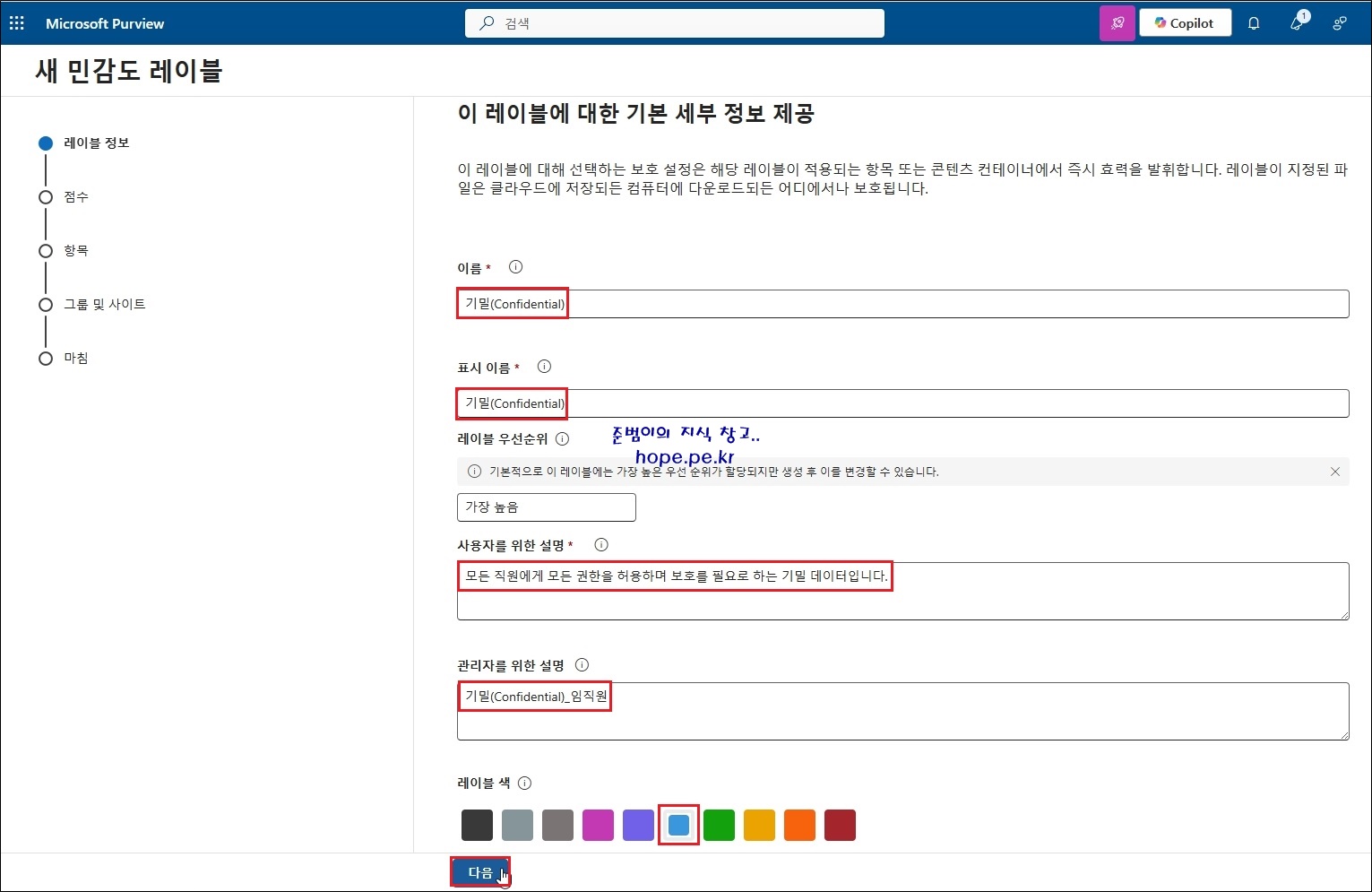 새 민감도 레이블 > 레이블 정보 화면에서, 다음 항목을 입력 및 선택 후 '다음' 을 클릭 합니다.