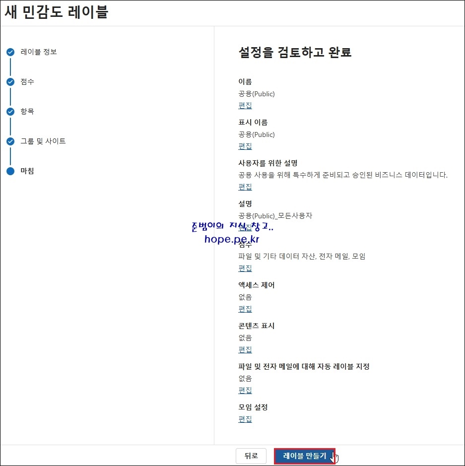 새 민감도 레이블 > 마침 > 설정을 검토하고 완료 화면에서, '레이블 만들기' 를 클릭 합니다.