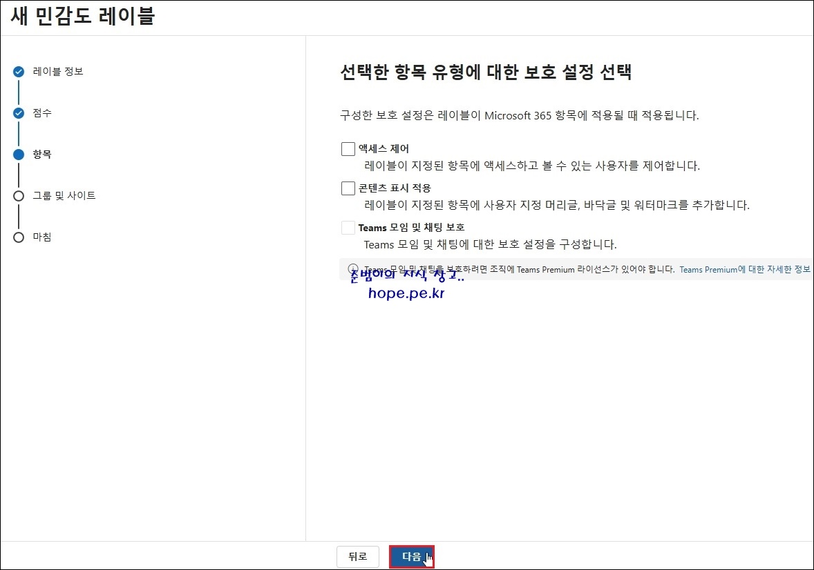 새 민감도 레이블 > 항목 > 선택한 항목 유형에 대한 보호 설정 선택 화면에서, 선택한 항목 유형에 대한 보호 설정 선택 없이 '다음' 을 클릭 합니다.