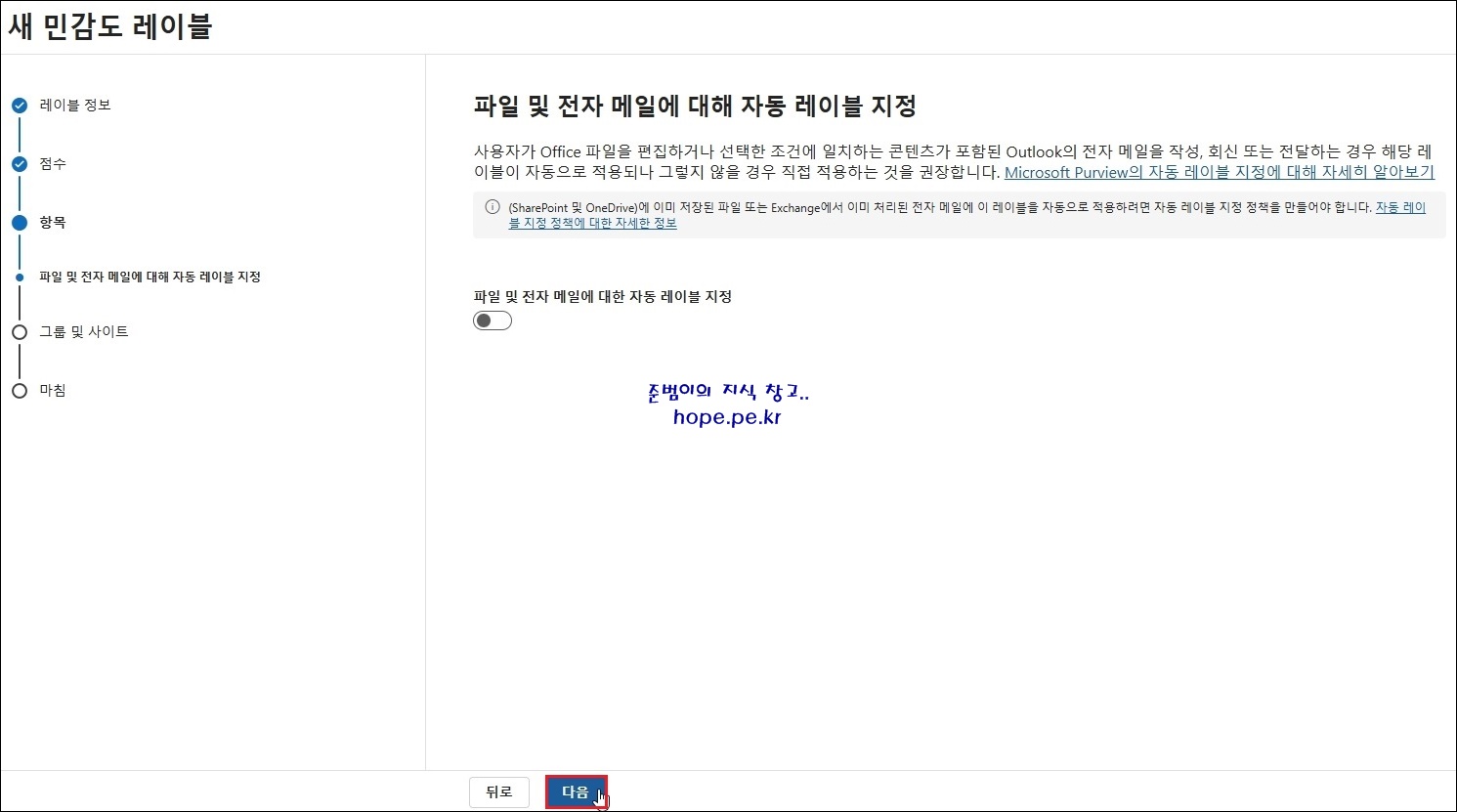 새 민감도 레이블 > 항목 > 파일 및 전자 메일에 대해 자동 레이블 지정 화면에서, '다음' 을 클릭 합니다.