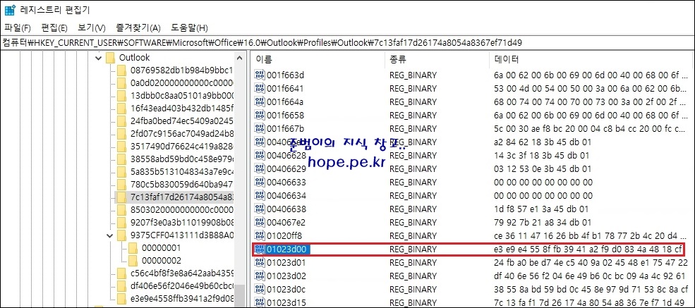 컴퓨터\HKEY_CURRENT_USER\SOFTWARE\Microsoft\Office\16.0\Outlook\Profiles\Outlook