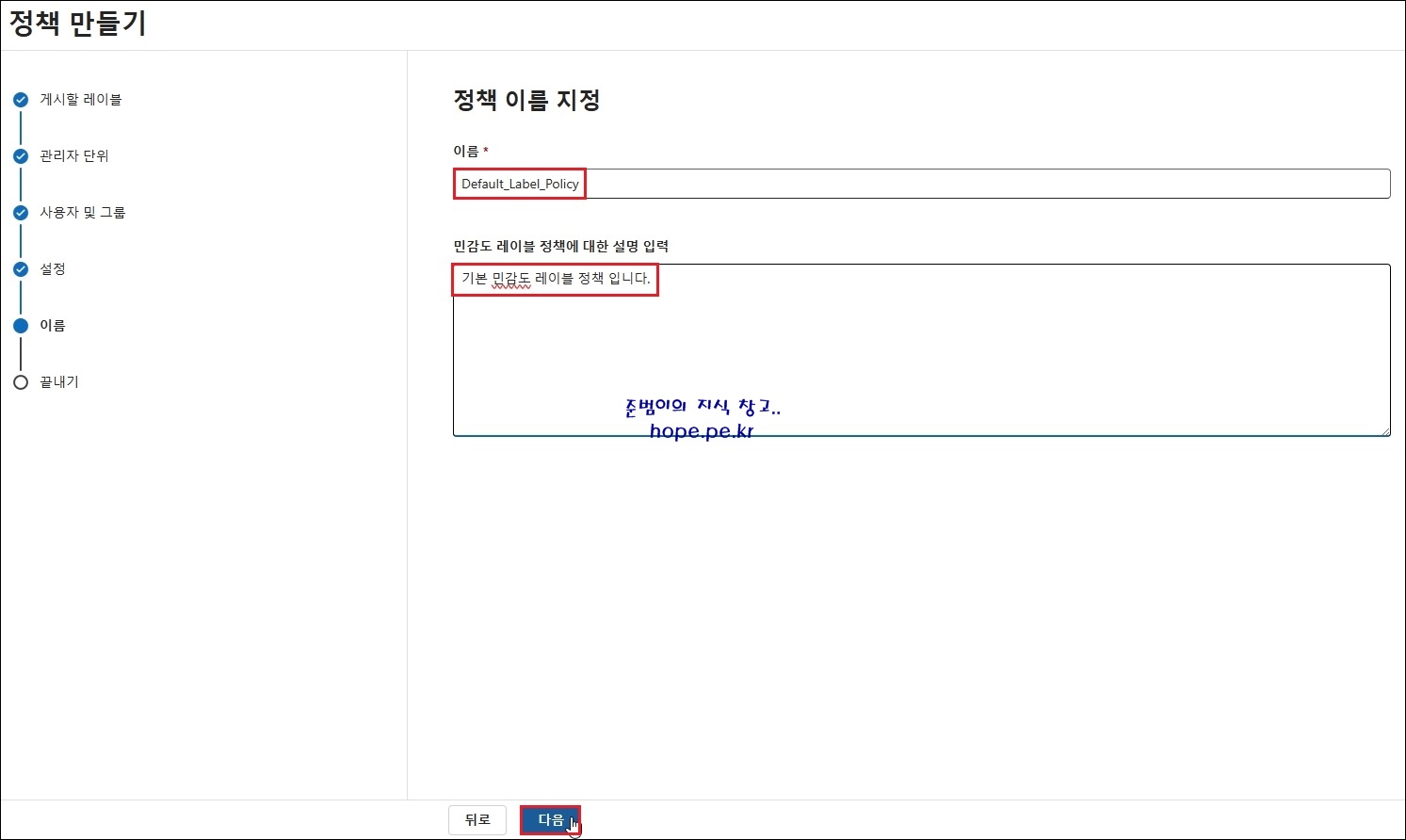 정책 만들기 > 정책 이름 지정 화면에서, '정책 이름' 및 '민감도 레이블 정책에 대한 설명' 입력 후 '다음' 을 클릭 합니다.