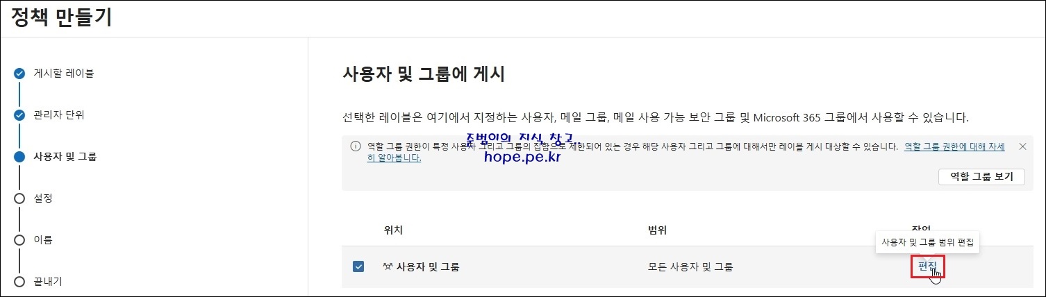 정책 만들기 > 사용자 및 그룹에 게시 화면에서, '편집' 을 클릭 합니다.