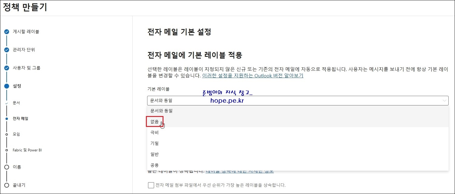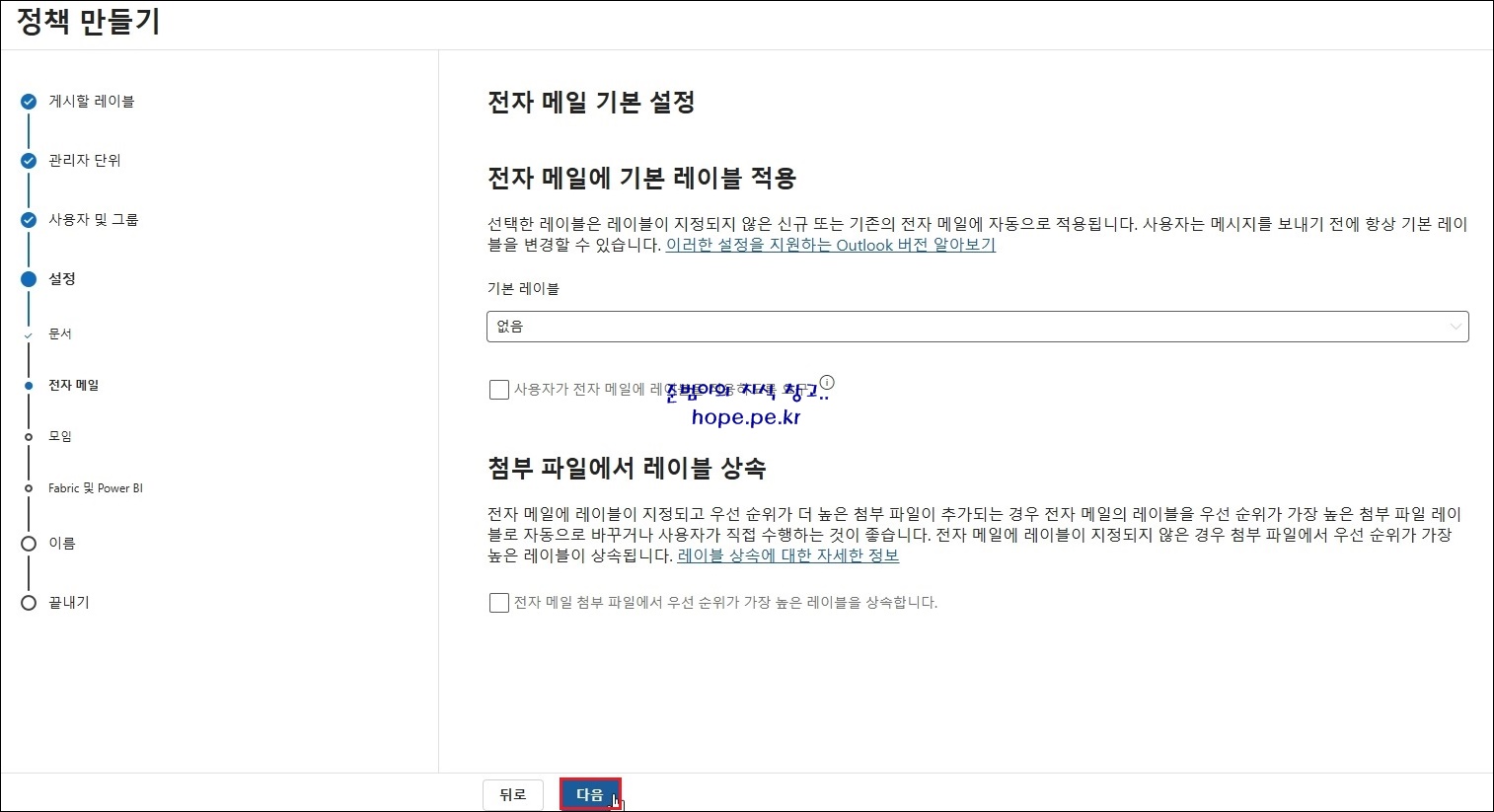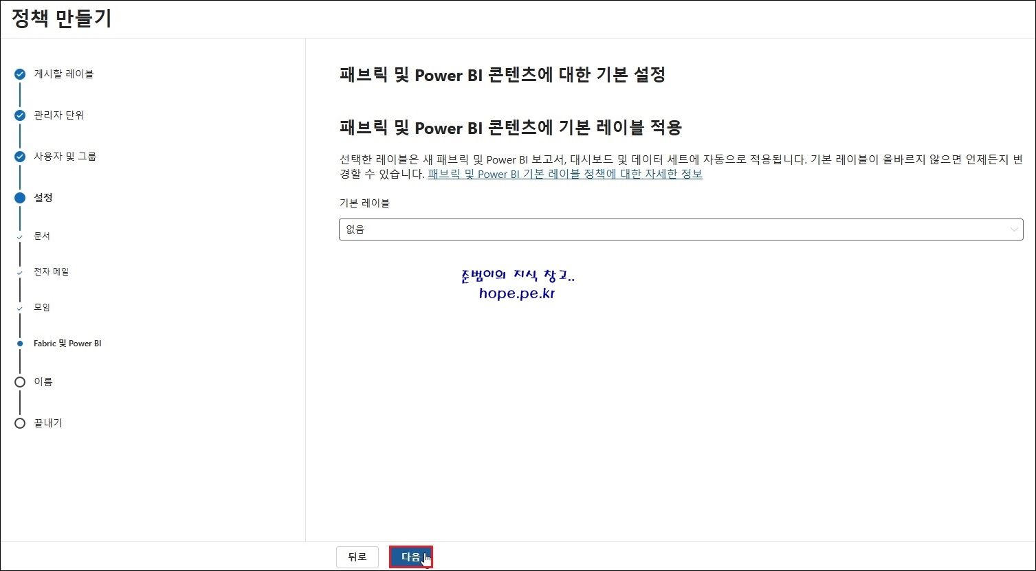 정책 만들기 > 문서 기본 설정 화면에서, '문서에 기본으로 적용할 레이블' 을 선택 후 '다음' 을 클릭 합니다.