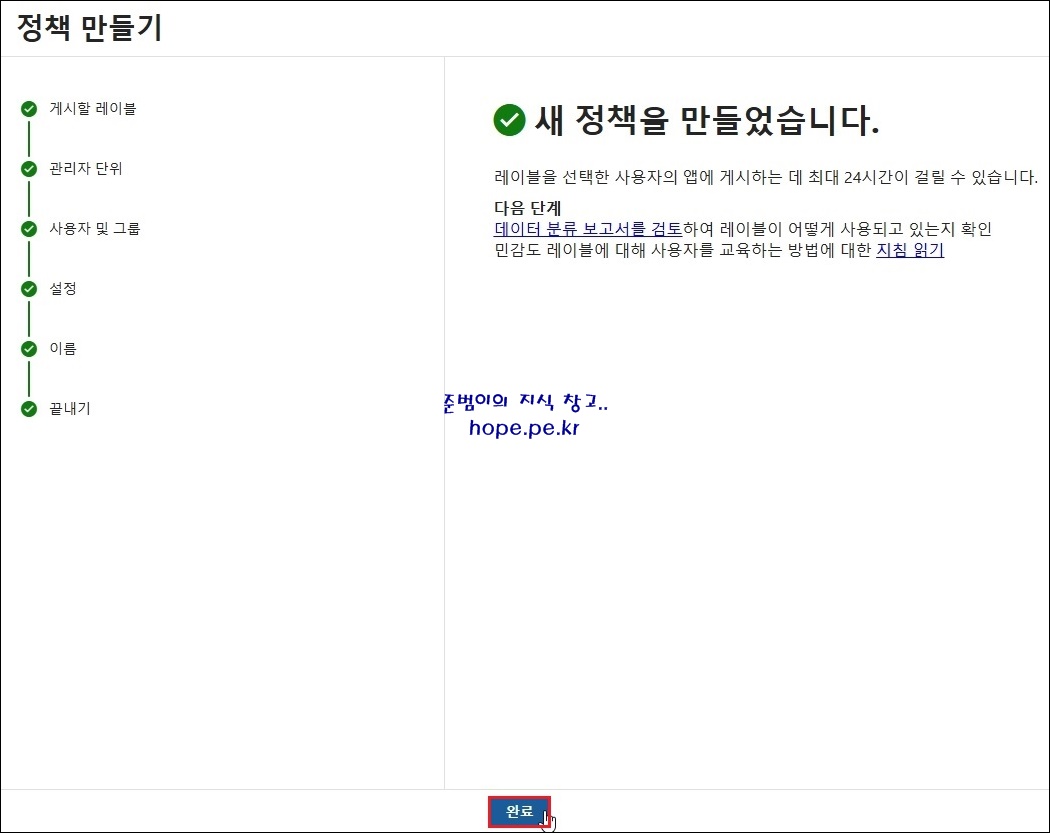 정책 만들기 > 새 정책을 만들었습니다. 화면에서, '완료' 를 클릭 합니다.