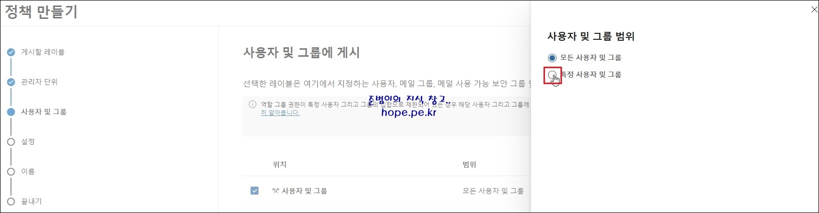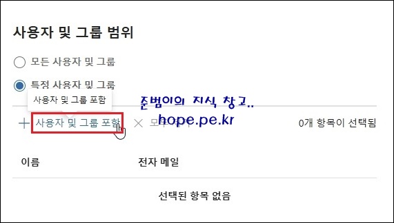 우측 사용자 및 그룹 범위 화면에서, '특정 사용자 및 그룹' 을 클릭 합니다.