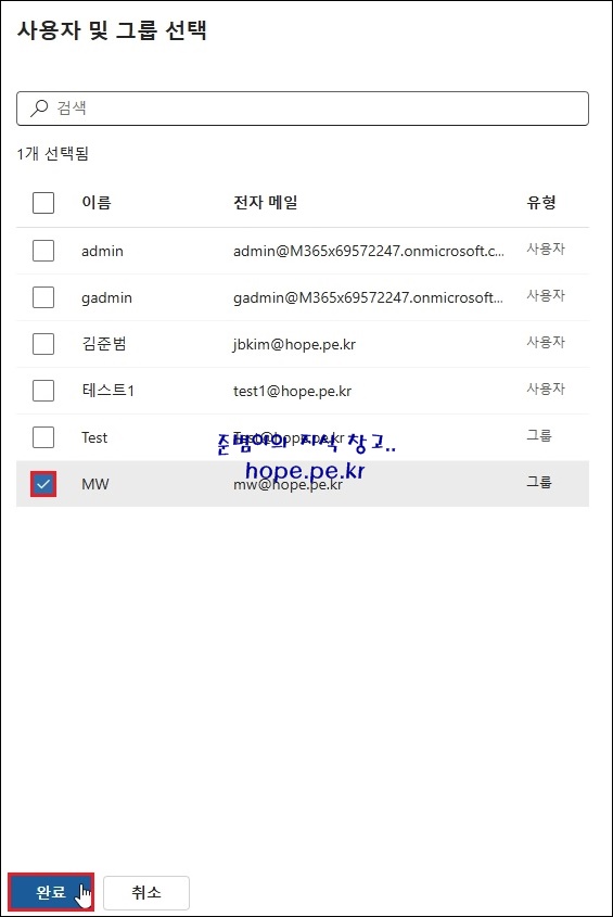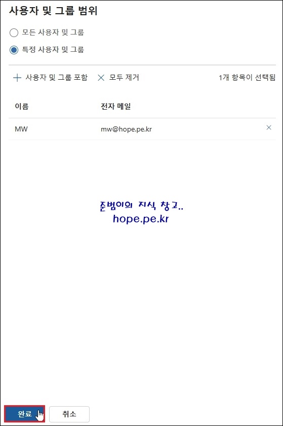 사용자 및 그룹 선택 화면에서, ' 정책을 게시할 그룹' 에 체크 후 '완료' 를 클릭 합니다.