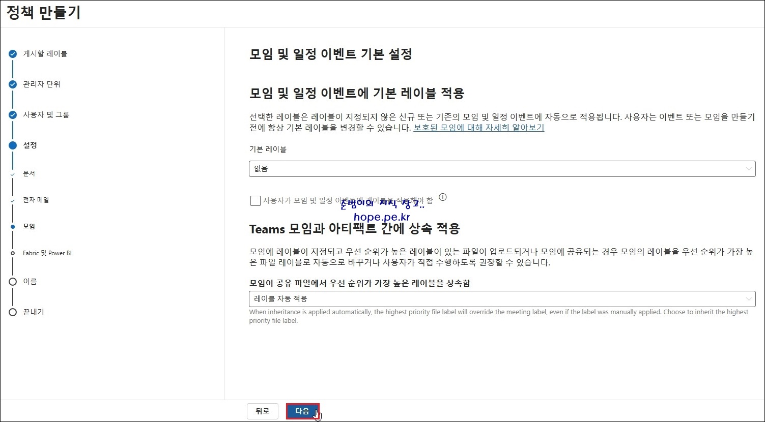 정책 만들기 > 모임 및 일정 이벤트 기본 설정 화면에서, '다음' 을 클릭 합니다.