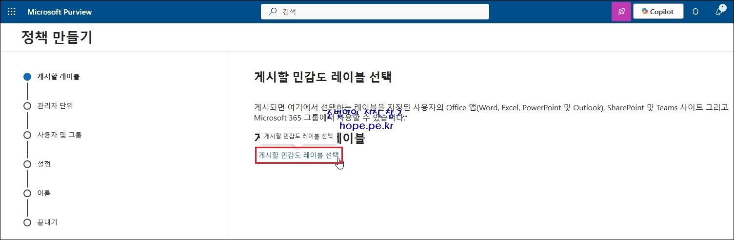 정책 만들기 > 게시할 레이블 화면에서, '게시할 민감도 레이블 선택' 을 클릭 합니다.