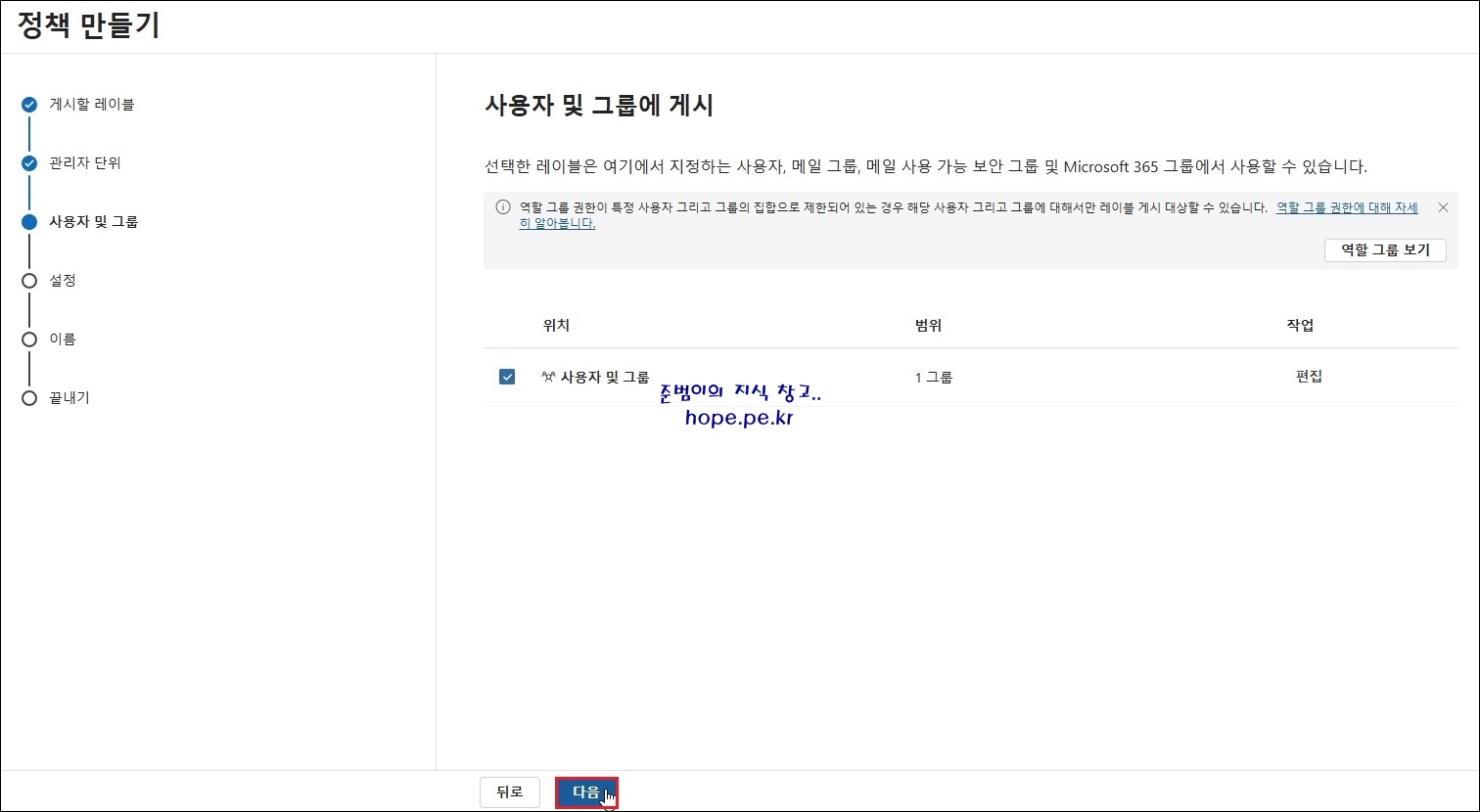 Cf) 선택한 레이블은 여기에서 지정하는 사용자, 메일 그룹, 메일 사용 가능 보안 그룹 및 Microsoft 365 그룹에서 사용할 수 있습니다.