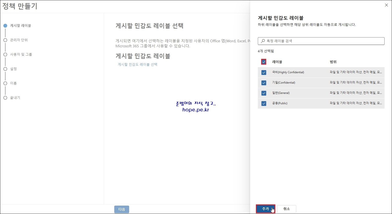 우측 게시할 민감도 레이블 화면에서, '게시할 민감도 레이블' 체크 후 '추가' 를 클릭 합니다.