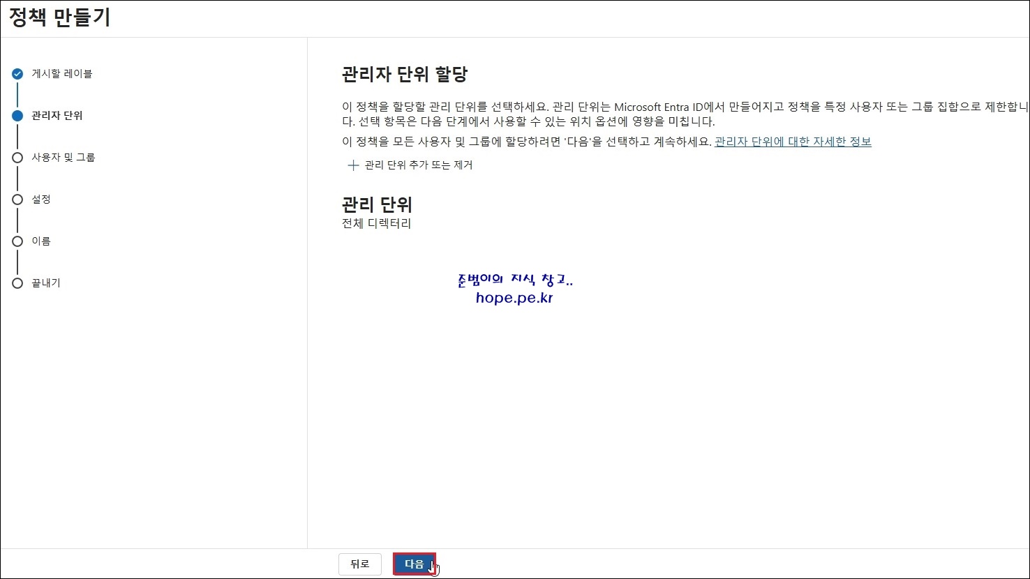 정책 만들기 > 관리자 단위 할당 화면에서, '다음' 을 클릭 합니다.