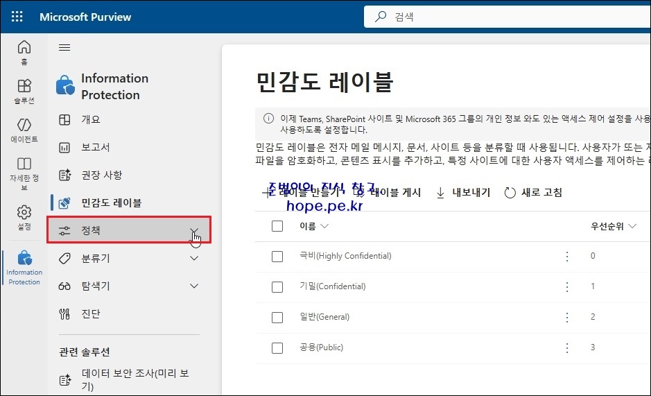 Microsoft Purview > Information Protection 화면에서, '정책' 을 클릭 합니다.