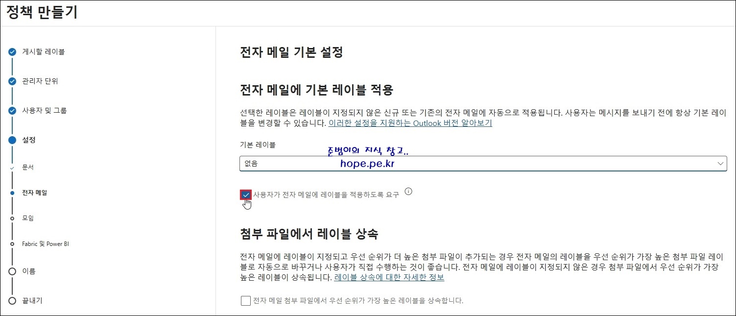 Cf) 이전에 '사용자가 전자 메일 메세지 및 문서에 레이블을 적용하도록 요구' 옵션을 선택한 경우 이 확인란을 선택 취소하여 전자 메일에 대한 요구 사항을 해제하세요.
