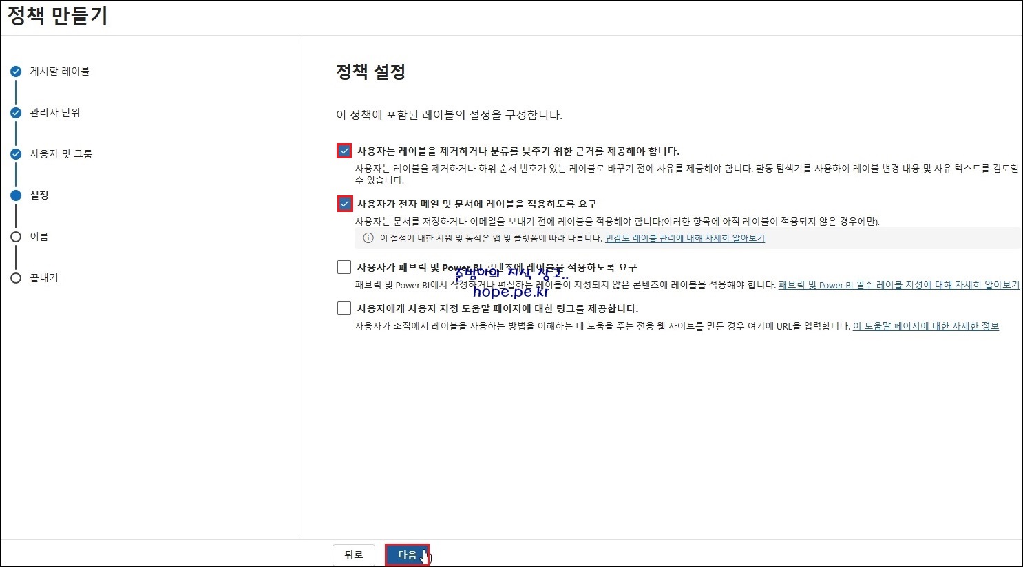 정책 만들기 > 정책 설정 화면에서, ' 정책에 포함된 레이블의 설정' 에 체크 후 '다음' 을 클릭 합니다.