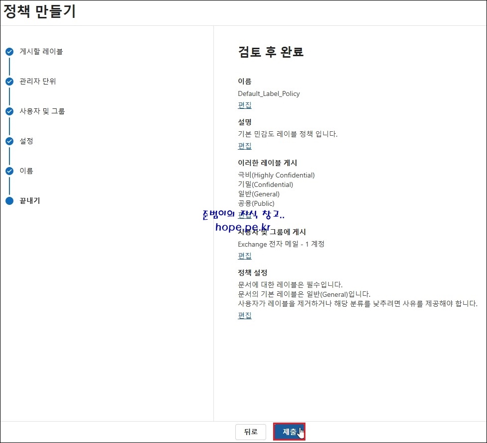 정책 만들기 > 검토 후 완료 화면에서, '제출' 을 클릭 합니다.