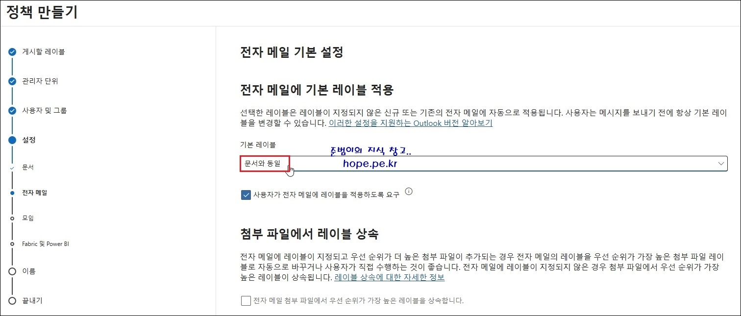 (본 포스팅에서는 '사용자는 레이블을 제거하거나 분류를 낮추기 위한 근거를 제공해야 합니다.' 및 '사용자가 전자 메일 및 문서에 레이블을 적용하도록 요구' 에 체크 하였습니다.)