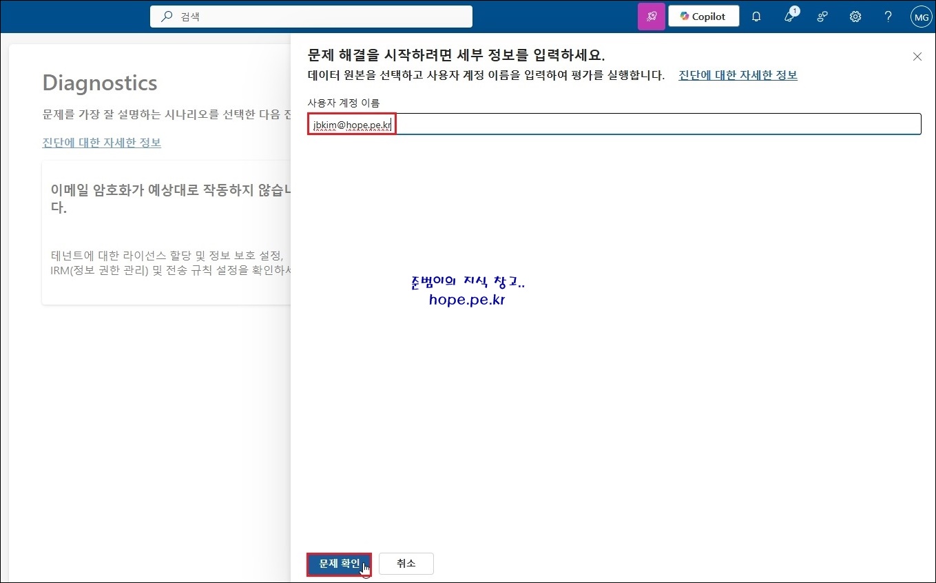 '사용자 계정 이름' 을 입력 후 '문제 확인' 을 클릭 합니다.