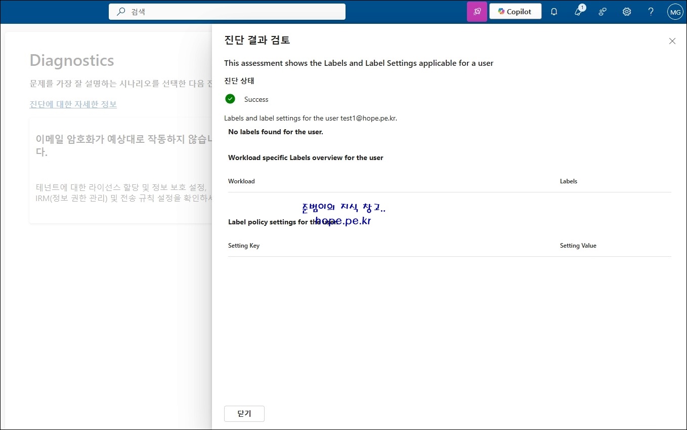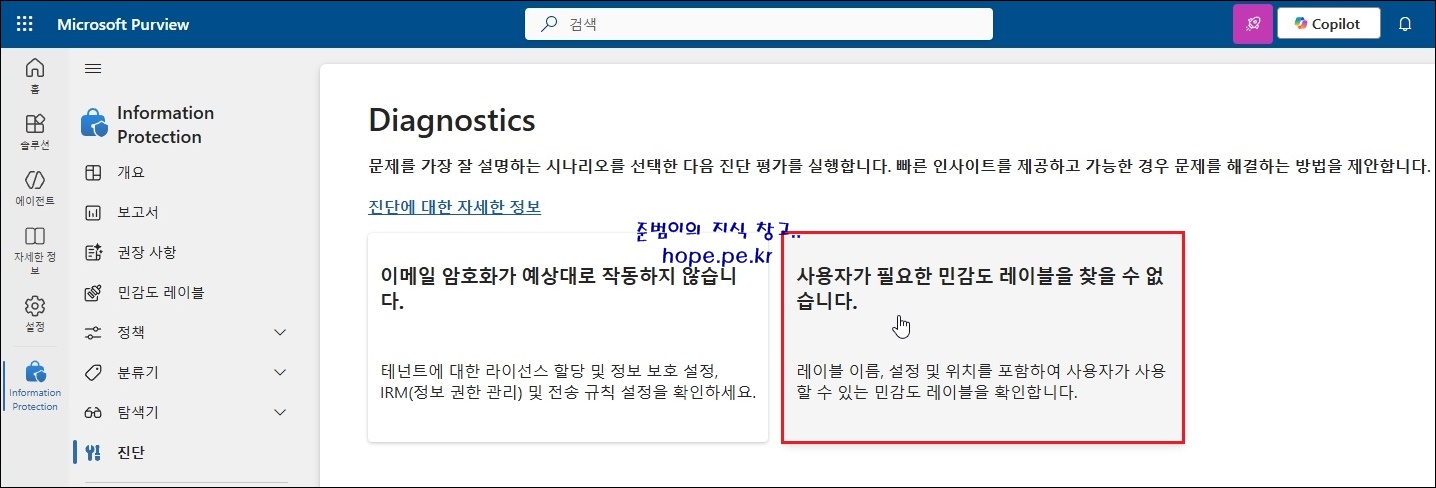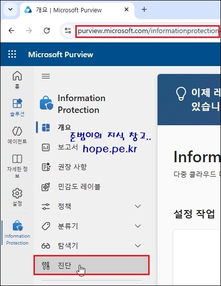 'Microsoft Purview > Information Protection 페이지(https://purview.microsoft.com/informationprotection) 에 접속 후 '진단' 을 클릭 합니다.