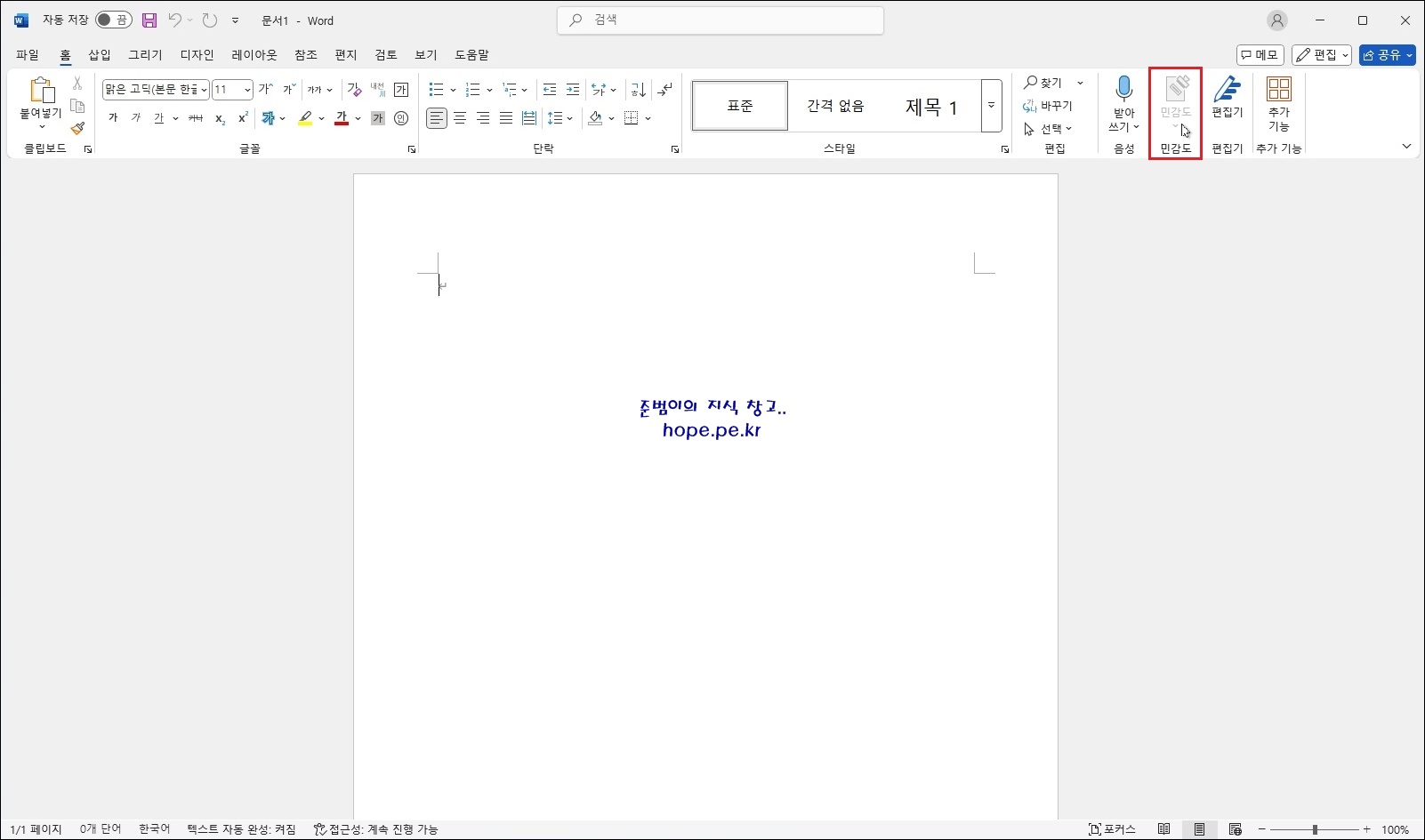 test1@hope.pe.kr 사용자 PC에서 Offie 프로그램 중 하나인 Word 프로그램을 실행해서 확인해보면 민감도 메뉴가 비활성화 되어있음을 확인 할 수 있습니다.