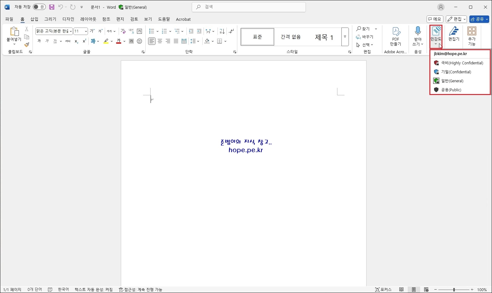 jbkim@hope.pe.kr 사용자 PC에서 Offie 프로그램 중 하나인 Word 프로그램을 실행해서, 실제 적용된 민감도를 확인해봅니다. 위 진단 결과와 같이 '극비(High Confidential), 기밀(Confidential), 일반(General), 공용(Public)' 레이블을 사용할 수 있음을 확인할 수 있습니다.
