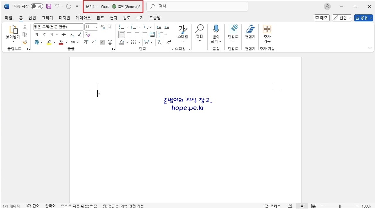 Word 프로그램이 실행되면 문서 상단에 '문서1 - Word (방패그림) 일반(General)*' 로 표시가 됩니다.