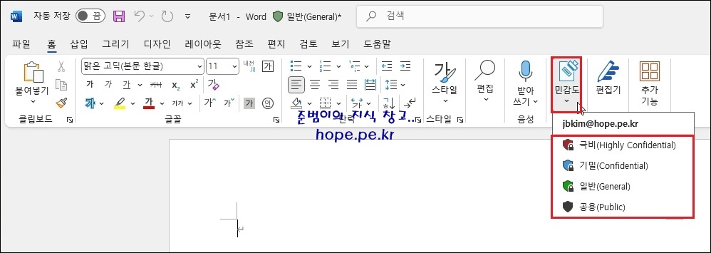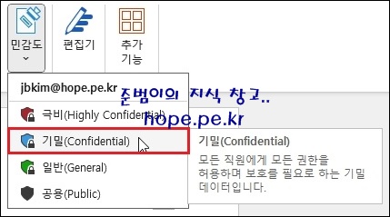 리본 메뉴에서 '민감도' 를 클릭 하면 해당 사용자에게 게시된 민감도 레이블 정책과 같이, 2) '극비(Highly Confidential), 기밀(Confidential), 일반(General), 공용(Public)' 민감도 레이블을 확인할 수 있습니다.