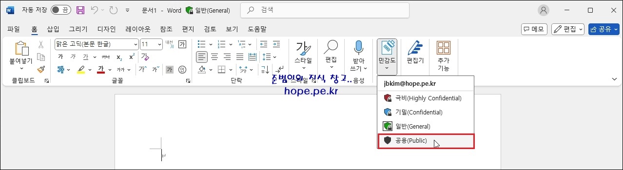 마지막으로 민감도를 '공용(Public)' 으로 중요도를 낮춰보겠습니다.