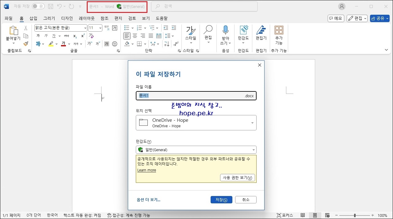 이 파일 저장하기 팝업창이 발생하면서, 문서 상단 문구 및 민감도 레이블 그림(방패)에 변화가 생겼습니다. 문구는 '문서1 - Word 일반(General)' 로 변경 되었고 (* 가 사라짐), 민감도 레이블 그림은 '방패+자물쇠' 로 변경 되었습니다.