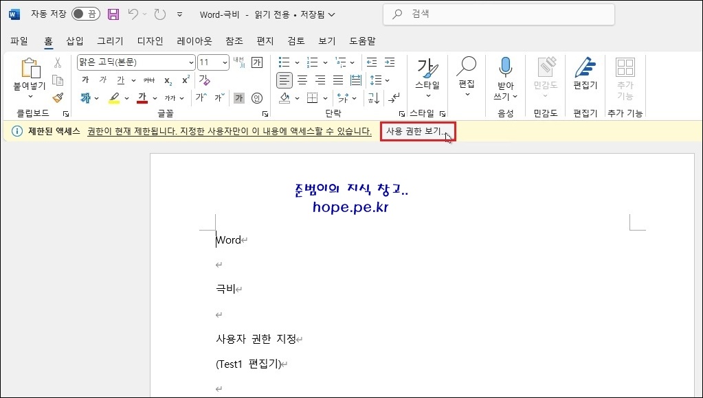 jbkim@hope.pe.kr 사용자의 PC에서 Word 프로그램 실행 > 간단히 문서 내용 작성 후 리본 메뉴의 '민감도' 를 클릭 합니다.