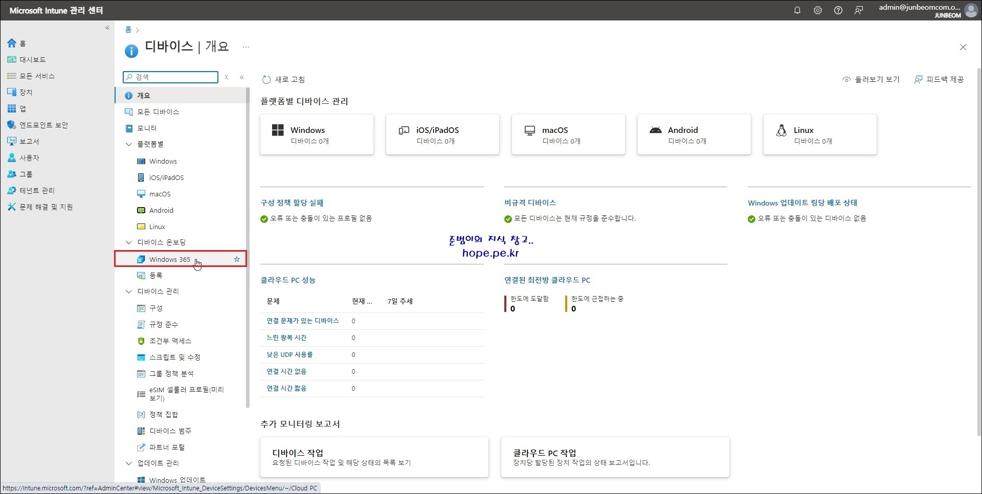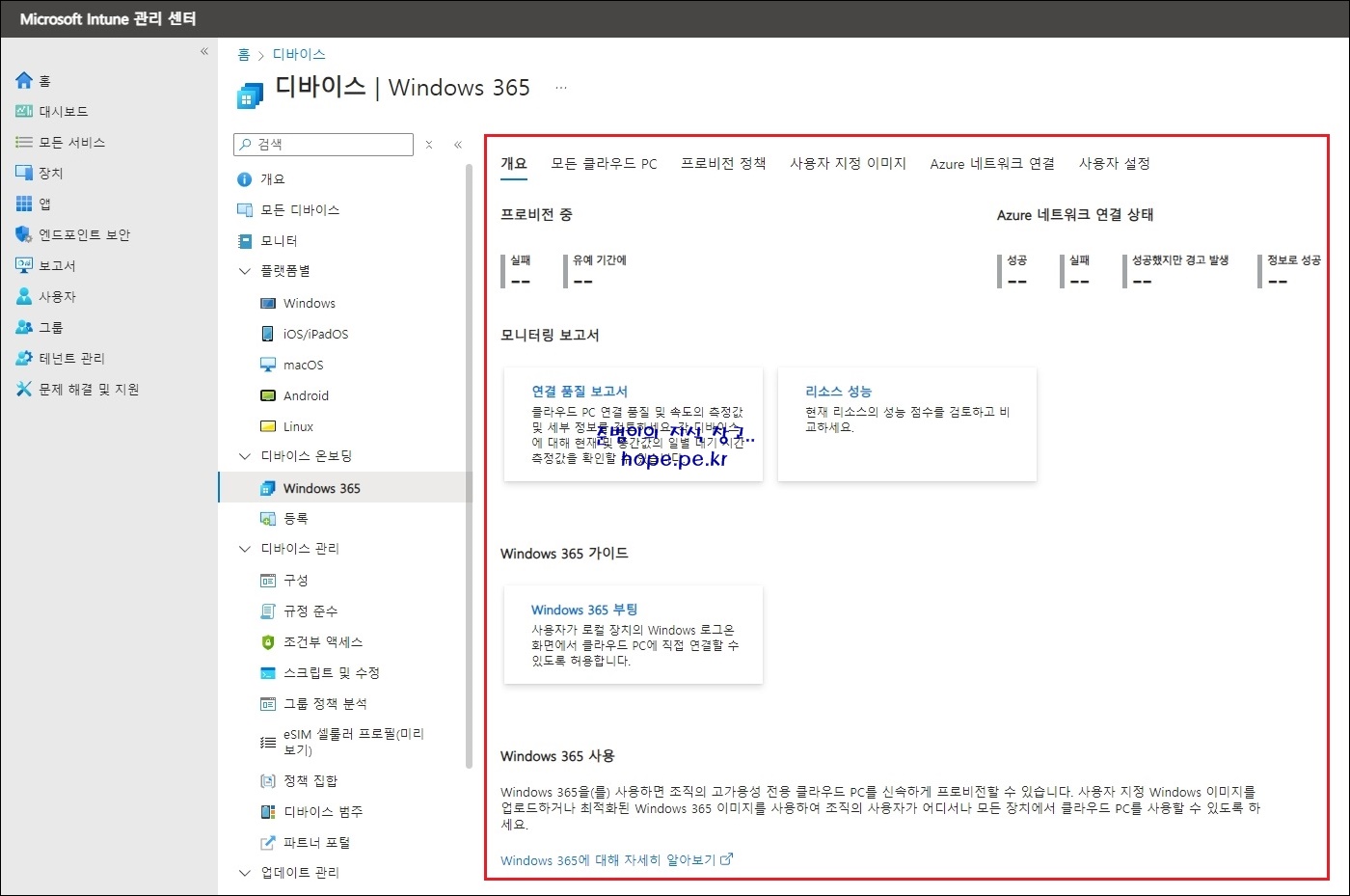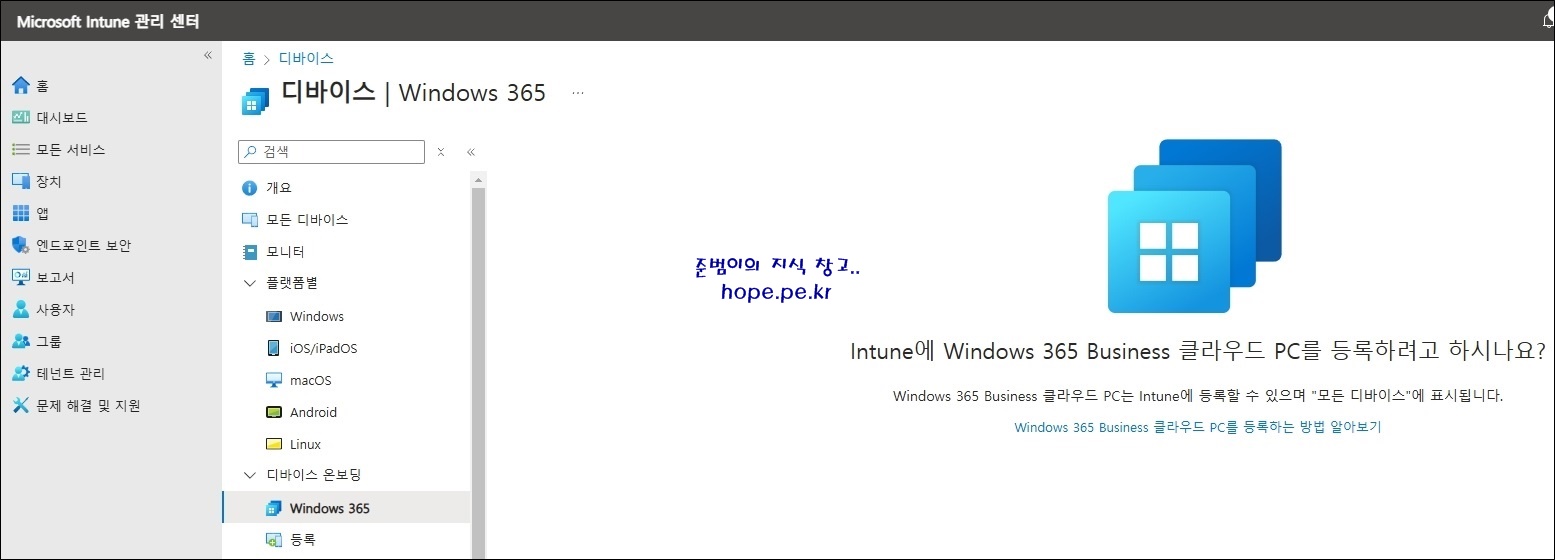 디바이스 화면에서, 디바이스 온보딩 > 'Windows 365' 를 클릭 합니다.
