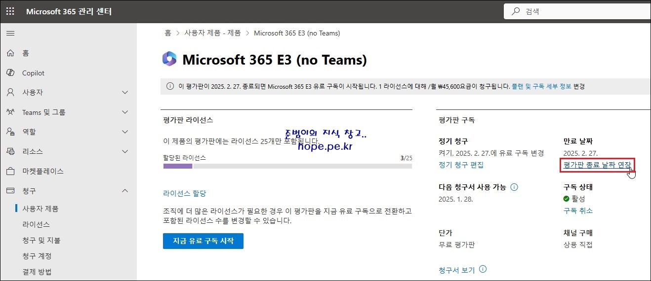 일반적으로 Microsoft 365 구독중에서 평가판을 제공하는 구독은, 평가판 연장(한 번만 30일 연장) 기능을 제공 합니다. 하지만 Windows 365는 평가판을 제공하지만 평가판 연장 기능을 제공하지는 않습니다.