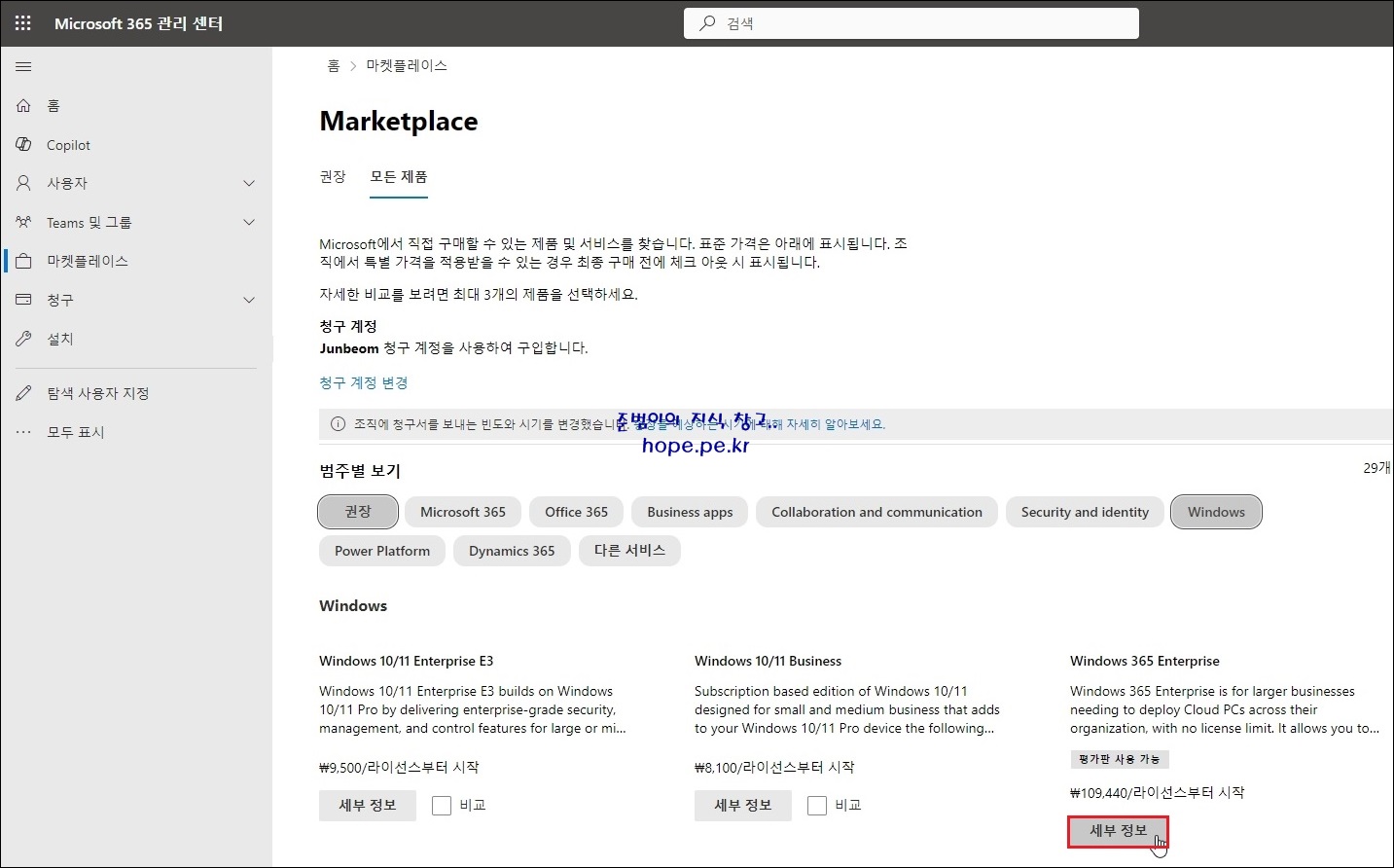 Windows 365 Enterprise 제품 페이지로 이동 되면, 평가판이 정상적으로 구독되었음을 확인 합니다.