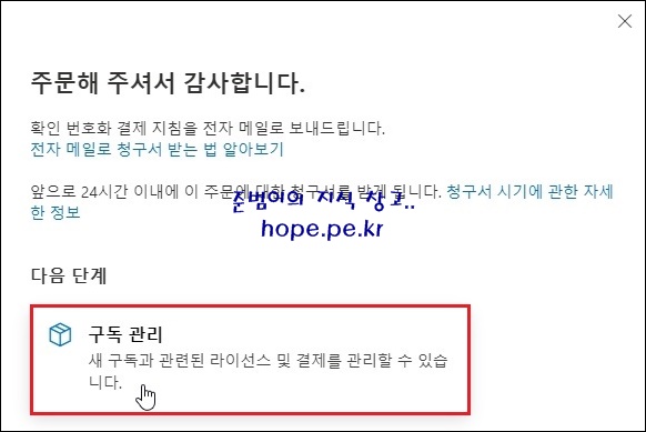 주문해 주셔서 감사합니다. 화면에서, '구독 관리' 를 클릭 합니다.