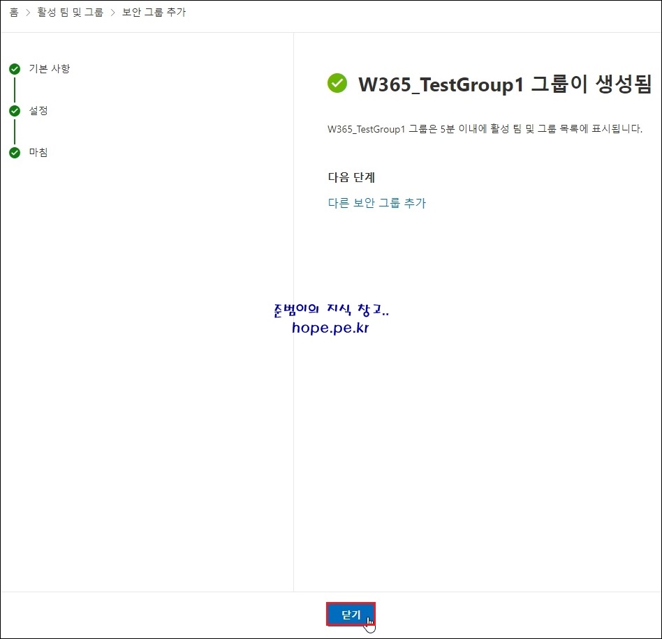 그룹이 생성됨 화면에서, '닫기' 를 클릭 합니다.