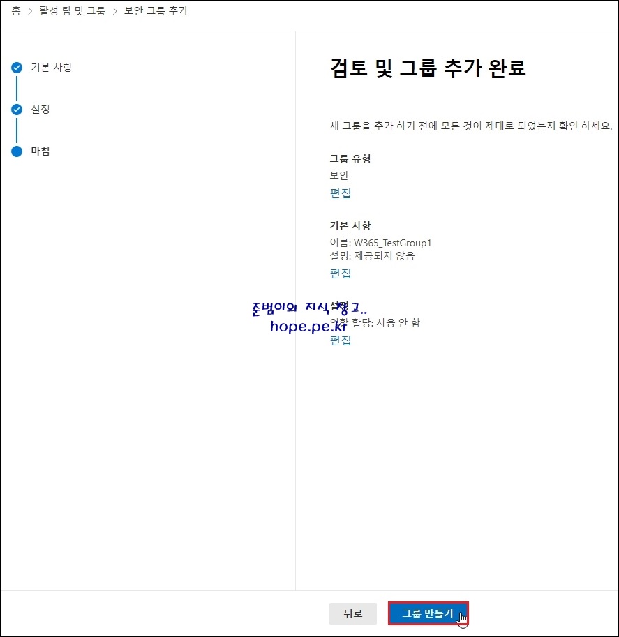 검토 및 그룹 추가 완료 화면에서, '그룹 만들기' 를 클릭 합니다.