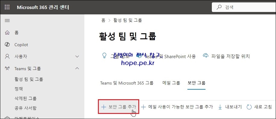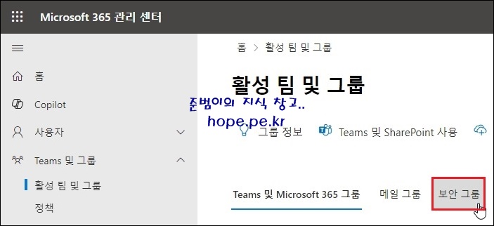 활성 팀 및 그룹 화면에서, '보안 그룹' 을 클릭 합니다.
