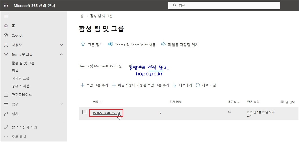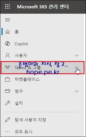 Microsoft 365 관리 센터 접속 후 'Teams 및 그룹' 을 클릭 합니다.