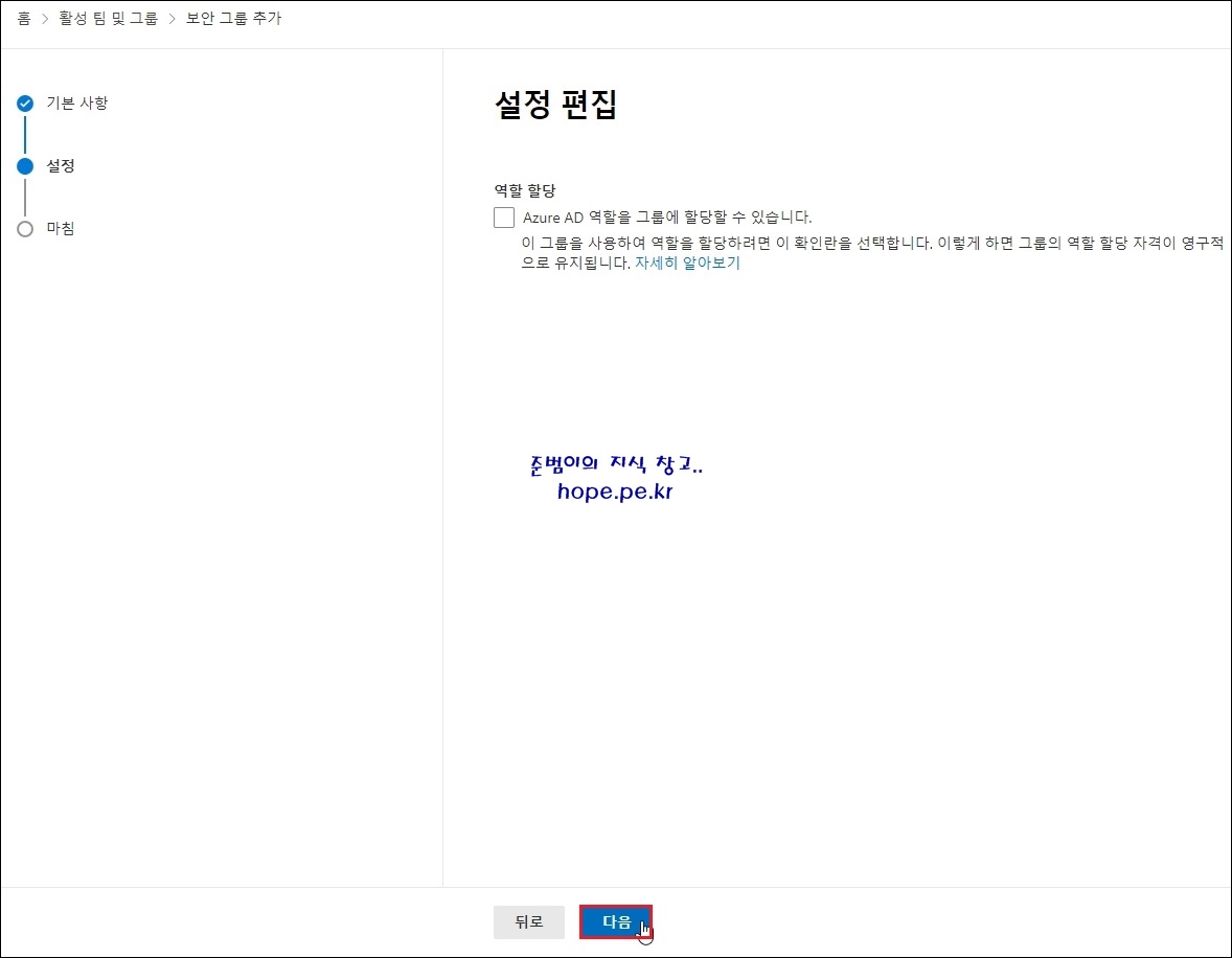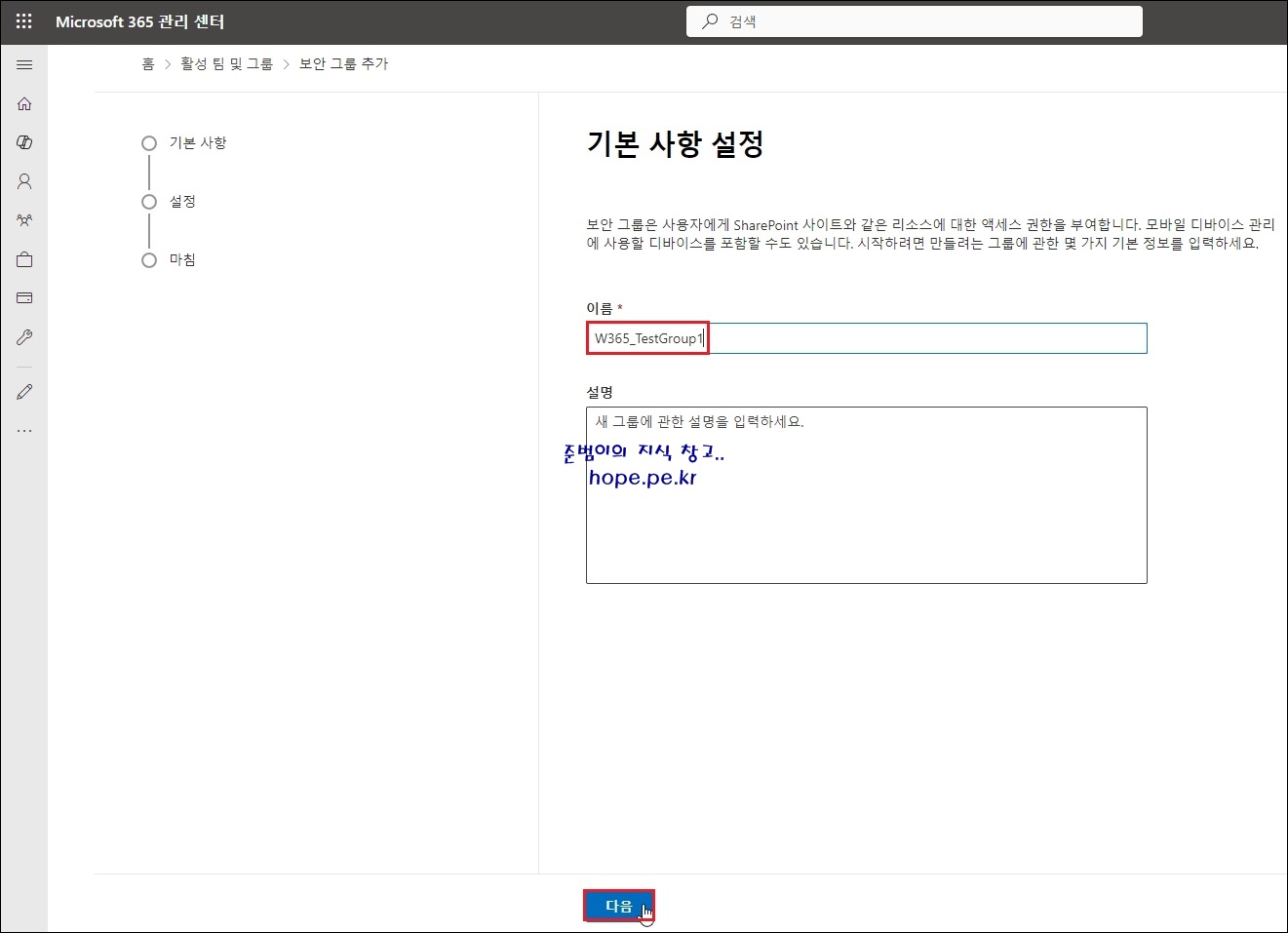 기본 사항 설정 화면에서, '보안 그룹 이름' 입력 후 '다음' 을 클릭 합니다.