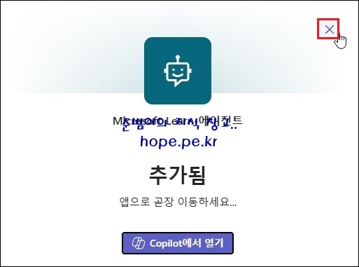 그러면 Teams가 실행되면서, 생성한 에이전트 창이 발생 합니다. '추가' 를 클릭 합니다.