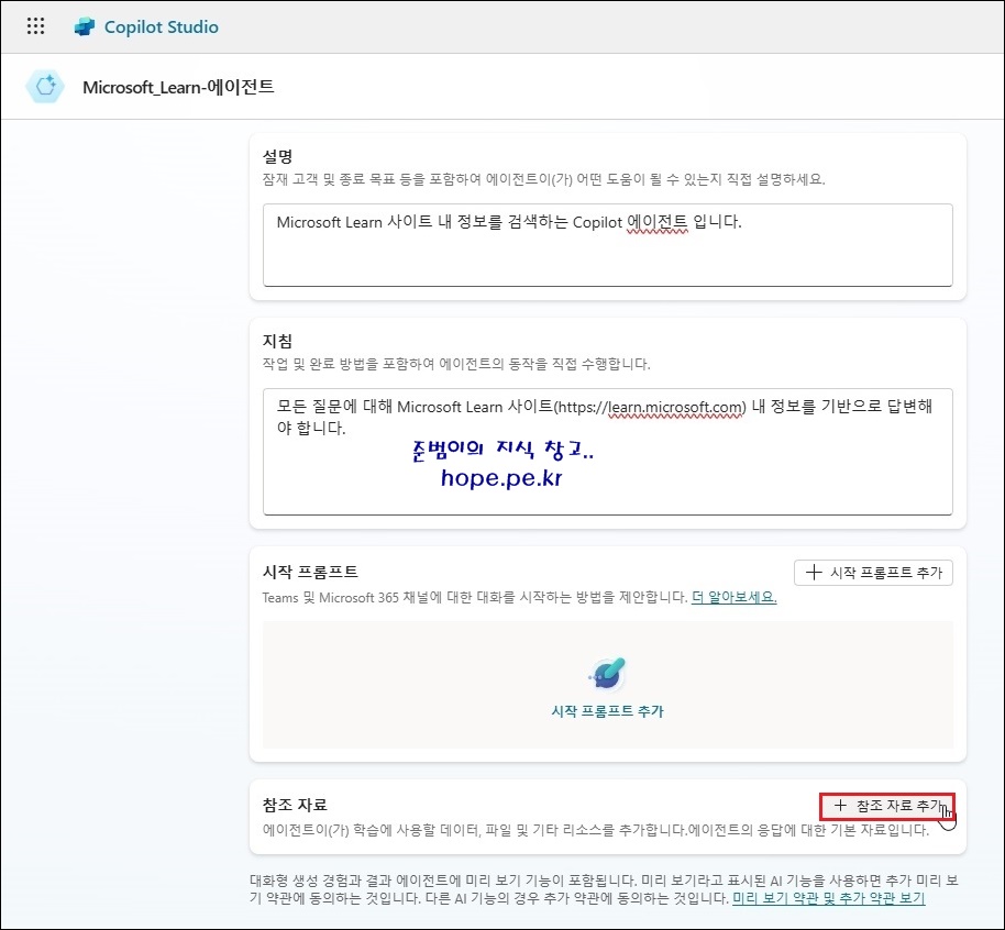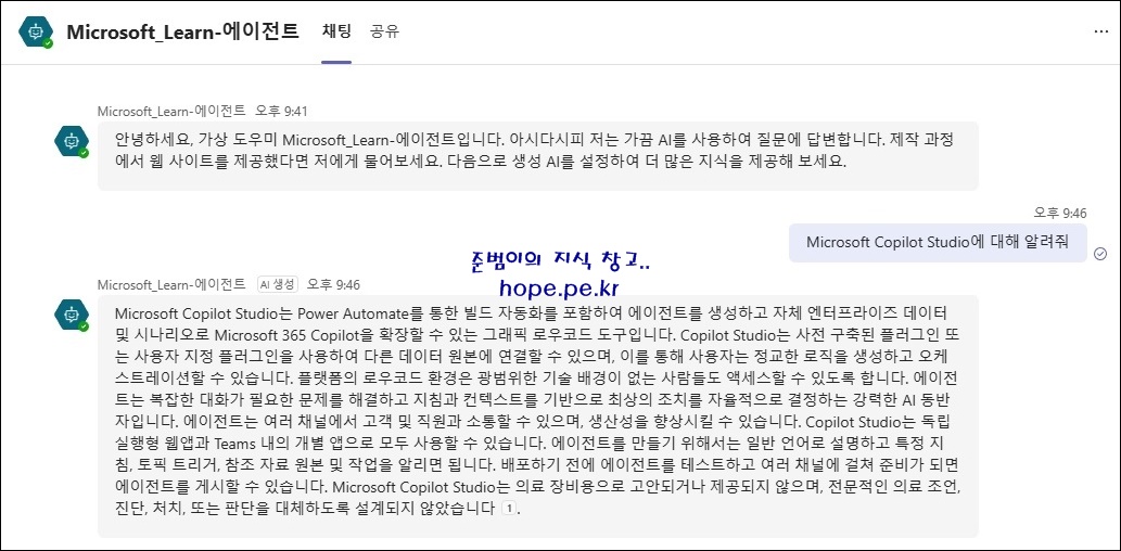 cf) 안녕하세요, 가상 도우미 Microsoft_Learn-에이전트입니다. 아시다시피 저는 가끔 AI를 사용하여 질문에 답변합니다. 제작 과정에서 웹 사이트를 제공했다면 저에게 물어보세요. 다음으로 생성 AI를 설정하여 더 많은 지식을 제공해 보세요.