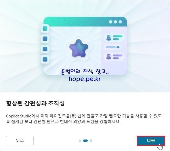 먼저 Copilot Studio 홈페이지(https://copilotstudio.microsoft.com)에 접속 합니다. 만약 안내 창이 발생하면, 안내 메세지 확인 후 '다음' 을 클릭 합니다.