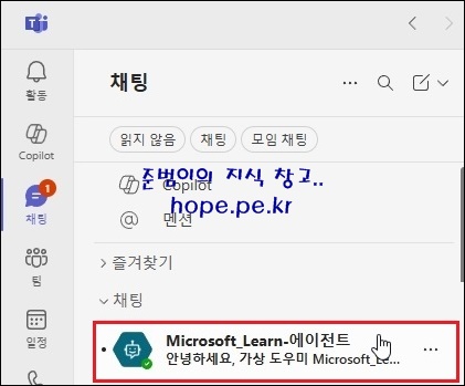 Teams의 좌측 메뉴에 해당 에이전트를 추가하여 사용도 가능 합니다.