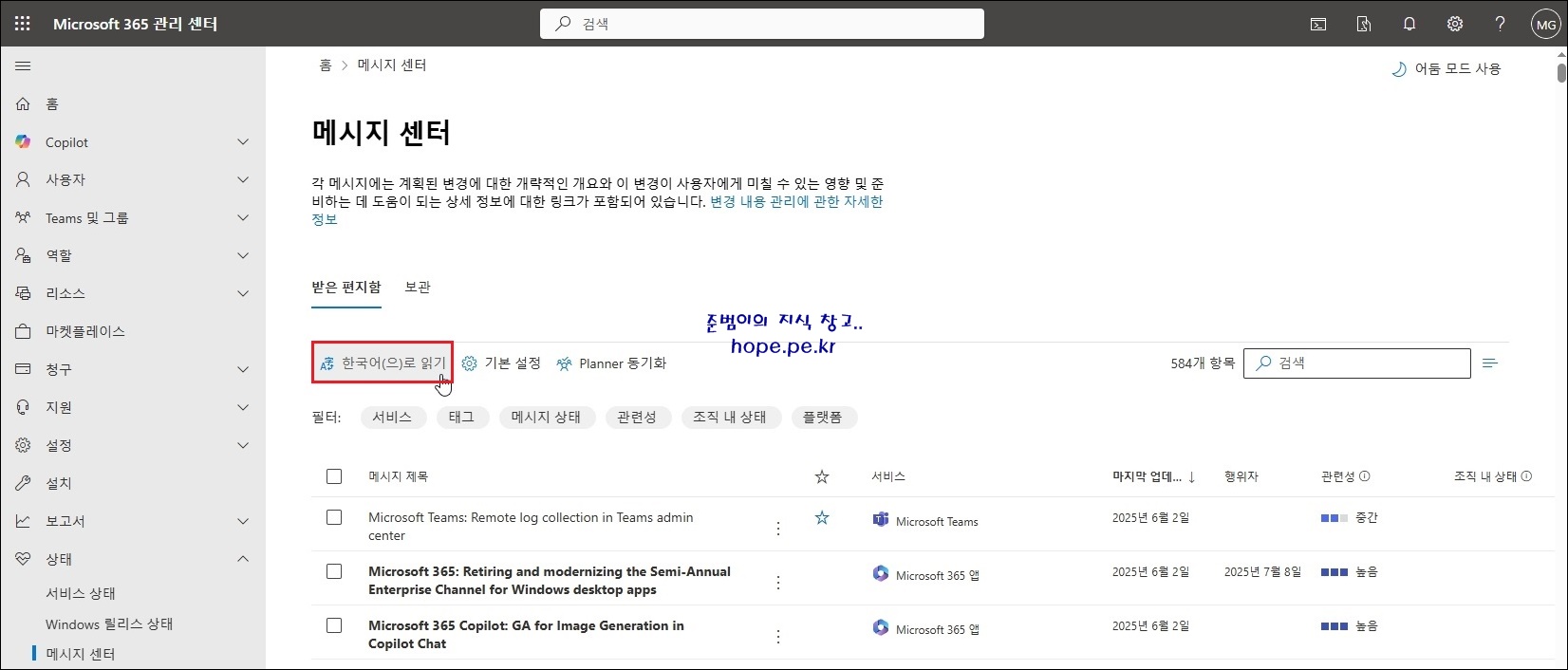 한국어로 변경된 메세지 센터의 메시지 중 하나를 클릭해보겠습니다.