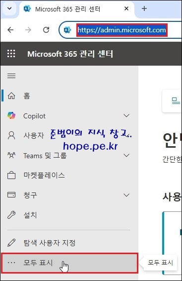 Microsoft 365 관리 센터 (https://admin.microsoft.com) 에 접속 후 '모두 표시' 를 클릭 합니다.